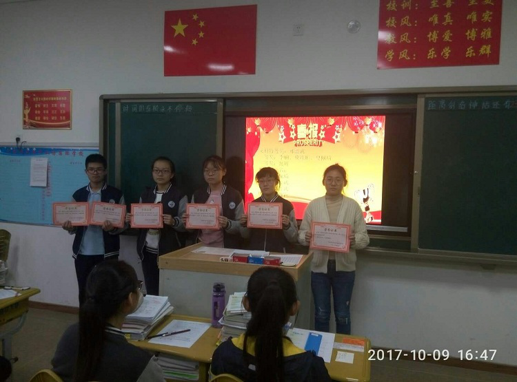 班會上,各班主任老師首先針對國慶放假前的第一次月考進行了總結(jié)發(fā)言,對綜合成績優(yōu)異、單科狀元、進步明顯的同學(xué)進行了表彰并頒發(fā)證書及獎品。