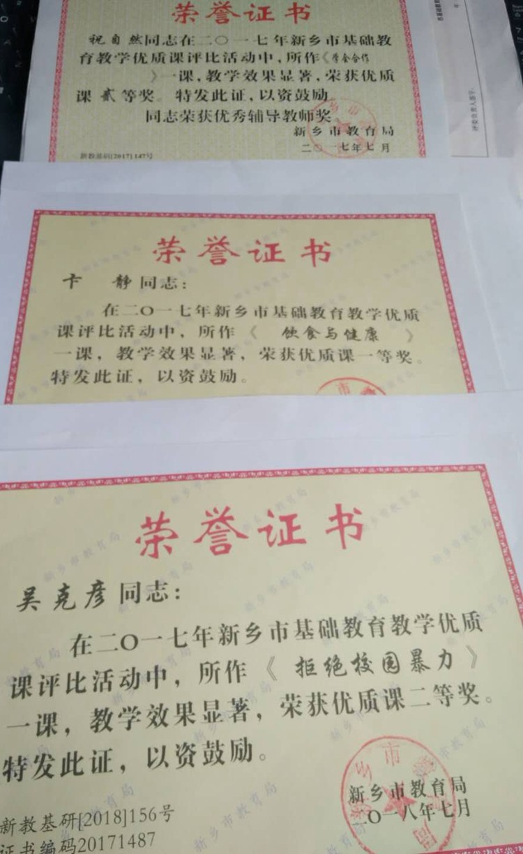 在2017年新鄉(xiāng)市健康教育優(yōu)質(zhì)課評(píng)比中,卞凈老師《飲食與健康》榮獲市一等獎(jiǎng),吳克彥老師《拒絕校園暴力》、祝自然老師《學(xué)會(huì)合作》喜獲市二等獎(jiǎng);在新鄉(xiāng)市衛(wèi)生工作優(yōu)秀論文比賽中,我校張小舉老師榮獲一等獎(jiǎng),平靜老師喜獲二等獎(jiǎng)!在此對(duì)以上獲獎(jiǎng)老師表示祝賀!