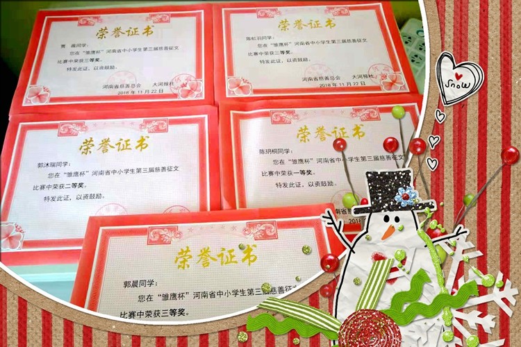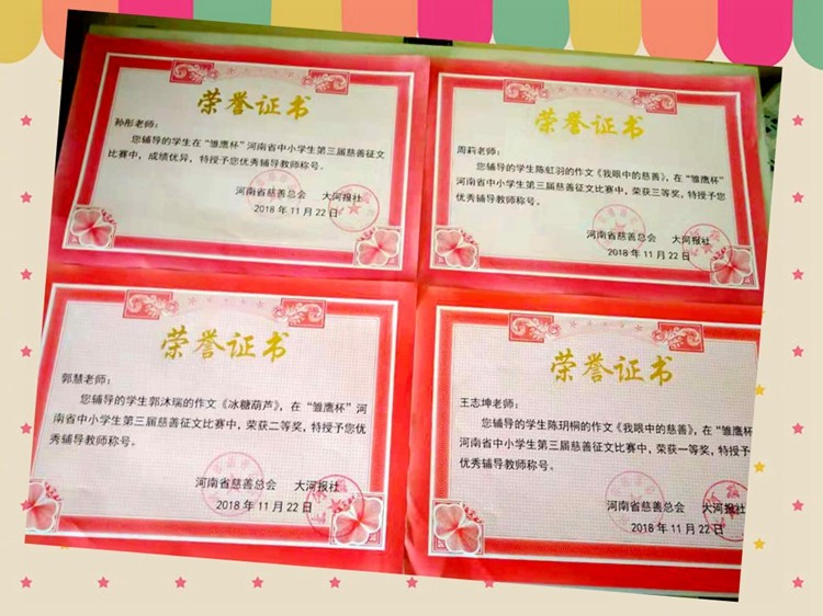 “雛鷹杯”河南省中小學(xué)生第三屆慈善征文比賽獲獎結(jié)果于2018年11月25日上午揭曉,我校黨支部書記兼教科研發(fā)中心主任李現(xiàn)山代表學(xué)校趕赴鄭州參加了頒獎典禮,值得祝賀的是我校5名選手從7萬多名參賽選手中脫穎而出,初中組征文共有17篇作文獲獎,我校占5篇,以絕對的比例成為本次頒獎典禮上的焦點,初一11班陳玥桐同學(xué)榮獲一等獎,初二3班郭沐瑞同學(xué)榮獲二等獎,初三2班郭晨、初二1班陳虹羽、初三2班賈薇3名同學(xué)喜獲三等獎;王志坤、郭慧、孫彤、周莉4名老師榮獲“優(yōu)秀輔導(dǎo)教師”稱號,河南師大附中雙語國際學(xué)校被授予優(yōu)秀組織獎稱號!