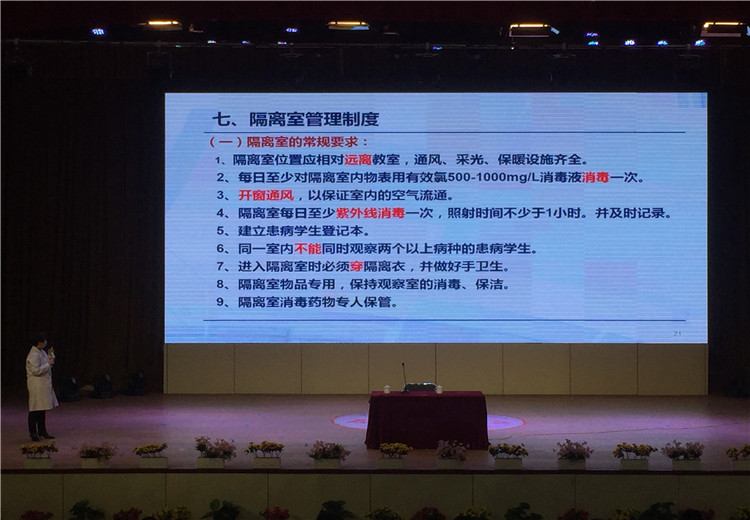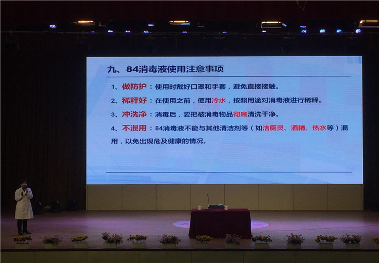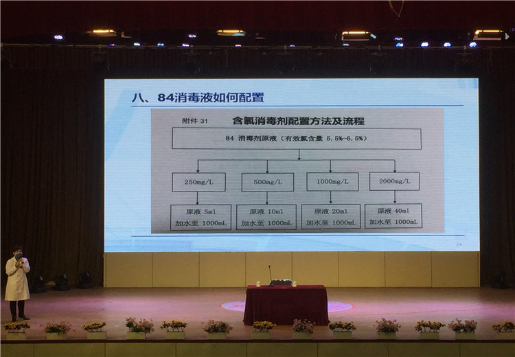 帥主任從新冠病毒相關(guān)知識(shí)、新冠病毒傳播途徑、如何做好個(gè)人防護(hù)、如何正確戴口罩、校園環(huán)境如何清潔消毒、隔離室的設(shè)置和管理制度、84消毒液如何配置及正確使用七個(gè)方面,向全體教職工進(jìn)行了詳細(xì)講解,使大家對(duì)于學(xué)校疫情防控的全流程、各環(huán)節(jié)都有了科學(xué)明確的認(rèn)知。講座過(guò)程中,帥主任根據(jù)自己豐富的知識(shí)儲(chǔ)備和經(jīng)驗(yàn)積累,特別強(qiáng)調(diào)了一些細(xì)節(jié),如:氯已定不能有效滅活病毒;病毒對(duì)紫外線(xiàn)和熱敏感,56℃以上30分鐘即可被殺滅;地面和公共區(qū)域設(shè)施用有效氯250~500mg/L含氯消毒劑擦拭,隔離室、垃圾桶等需用有效氯500~1000mg/L消毒液消毒;門(mén)把手、鍵盤(pán)、鼠標(biāo)等金屬物品表面不能用84等含氯消毒液,需用用75%的酒精清潔消毒;同一隔離室內(nèi)不能同時(shí)觀(guān)察兩個(gè)以上病種的患病學(xué)生等。