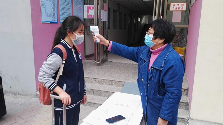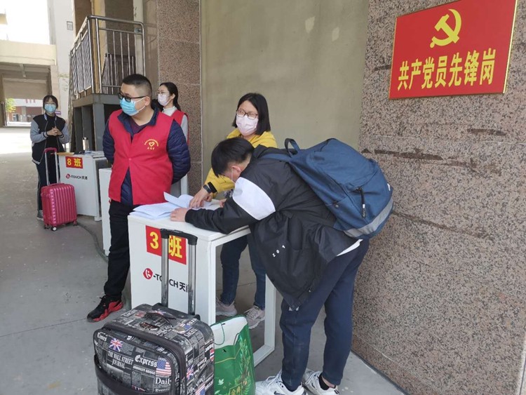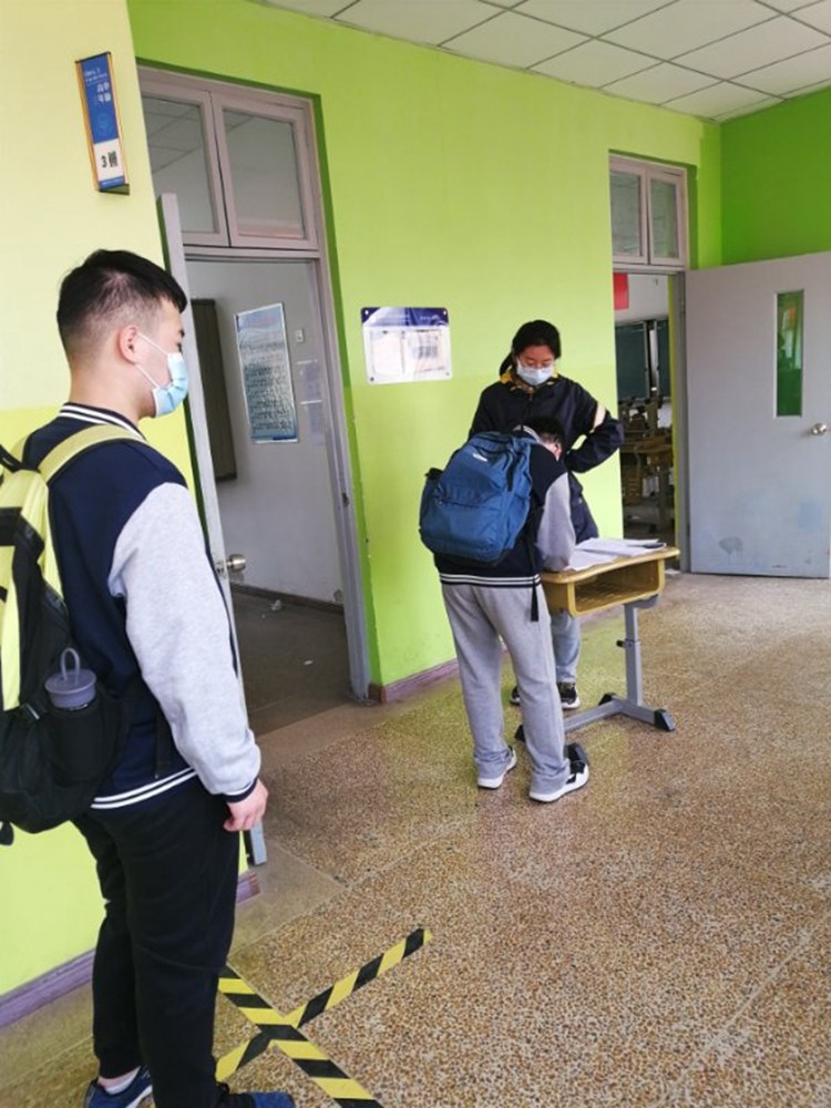 下午2時許,學(xué)生們戴著口罩陸續(xù)到達(dá)校門口,從車上卸下行李后,在教師志愿者的幫助下,學(xué)生們間隔1米以上距離測溫入校、行李消毒、清潔消毒,體溫檢測正常后有序地到各班報(bào)到處報(bào)到,遞交《健康登記卡》、《健康安全承諾書》等。