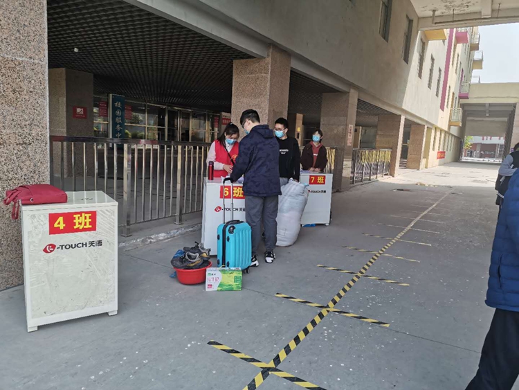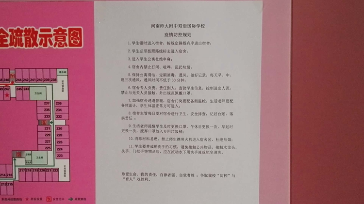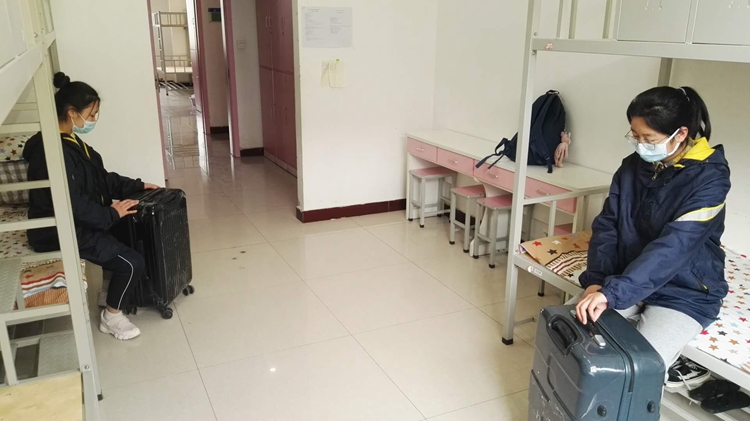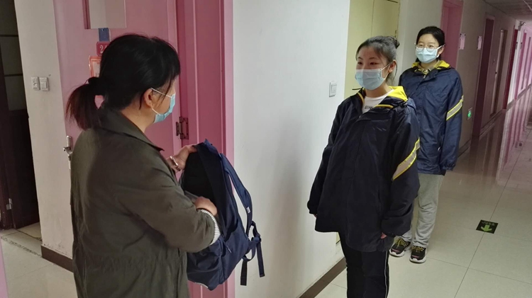 進(jìn)入宿舍時進(jìn)行二次測溫、登記信息,體溫正常者按指定路線到達(dá)提前分配好的宿舍,經(jīng)生活老師檢查合格后方可進(jìn)入房間,生活老師提醒學(xué)生遵守宿舍防控規(guī)則。