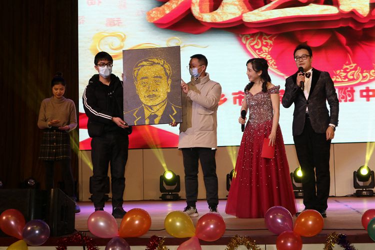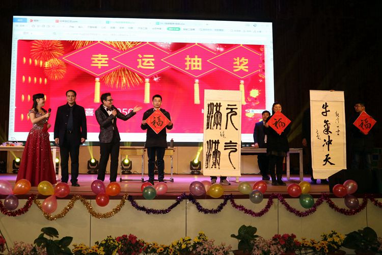 工會(huì)主席王有波和吉士彪老師的書(shū)法表演在楊惠諾老師典雅的古箏伴奏中,成為了晚會(huì)新的熱點(diǎn)。王主席和吉老師在現(xiàn)場(chǎng)揮毫潑墨,展示出深厚和扎實(shí)的書(shū)法功底,三個(gè)福字蒼勁有力、姿態(tài)各異!“牛氣沖天”“元?dú)鉂M(mǎn)滿(mǎn)”條幅氣勢(shì)雄渾!隨后現(xiàn)場(chǎng)抽獎(jiǎng)將作品贈(zèng)送給幸運(yùn)觀眾,將全場(chǎng)火爆的氣氛再度點(diǎn)燃。接下來(lái)讓人耳目一新的還有楊帆老師現(xiàn)場(chǎng)所作的滑秀林校長(zhǎng)金粉畫(huà)像,在金粉的潑灑下畫(huà)面頓時(shí)撥開(kāi)云霧,滑校長(zhǎng)熟悉又可親的面龐映入眼簾,驚艷了整個(gè)會(huì)場(chǎng)。
