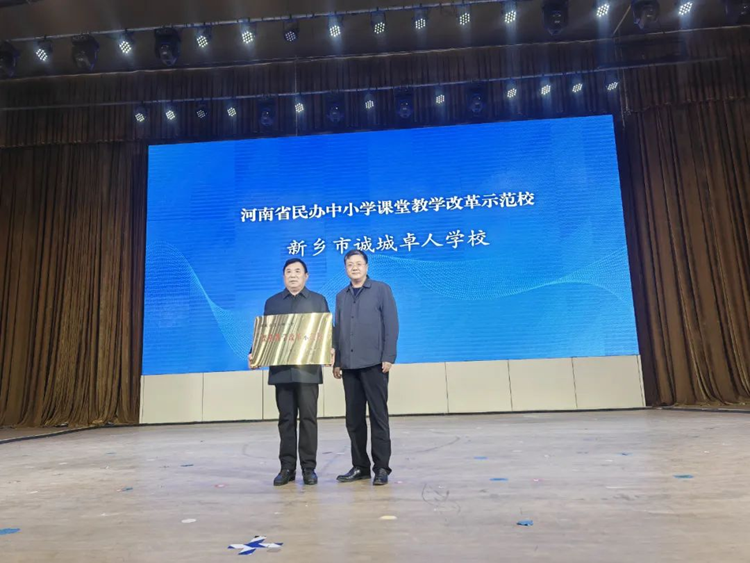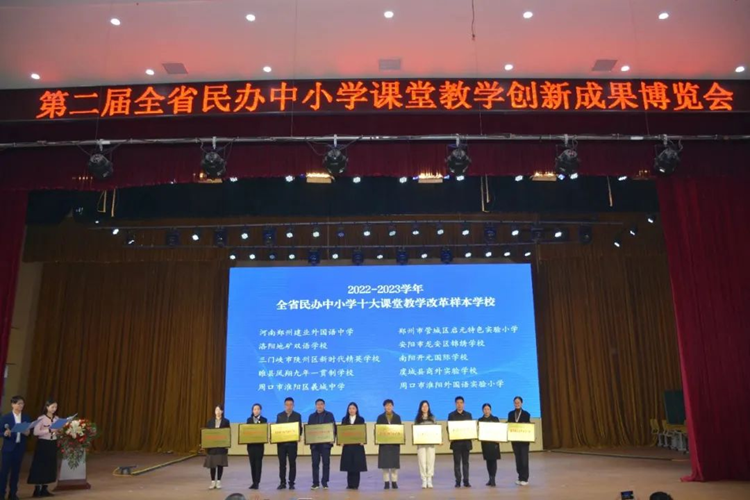 為表彰先進、鼓舞士氣,深入推進民辦中小學創(chuàng)新課改工作,閉幕式上,河南省民辦教育研究會副會長兼秘書長曹占武為獲得2022-2023學年“全省民辦中小學十大課堂教學改革樣本學?!鳖C發(fā)獎牌,我?!皩W自主四環(huán)八步”課堂教學范式獲得大會領導、專家、與會代表的一致認可,成為本屆課博會唯一一所“全省民辦中小學課改示范?!?。