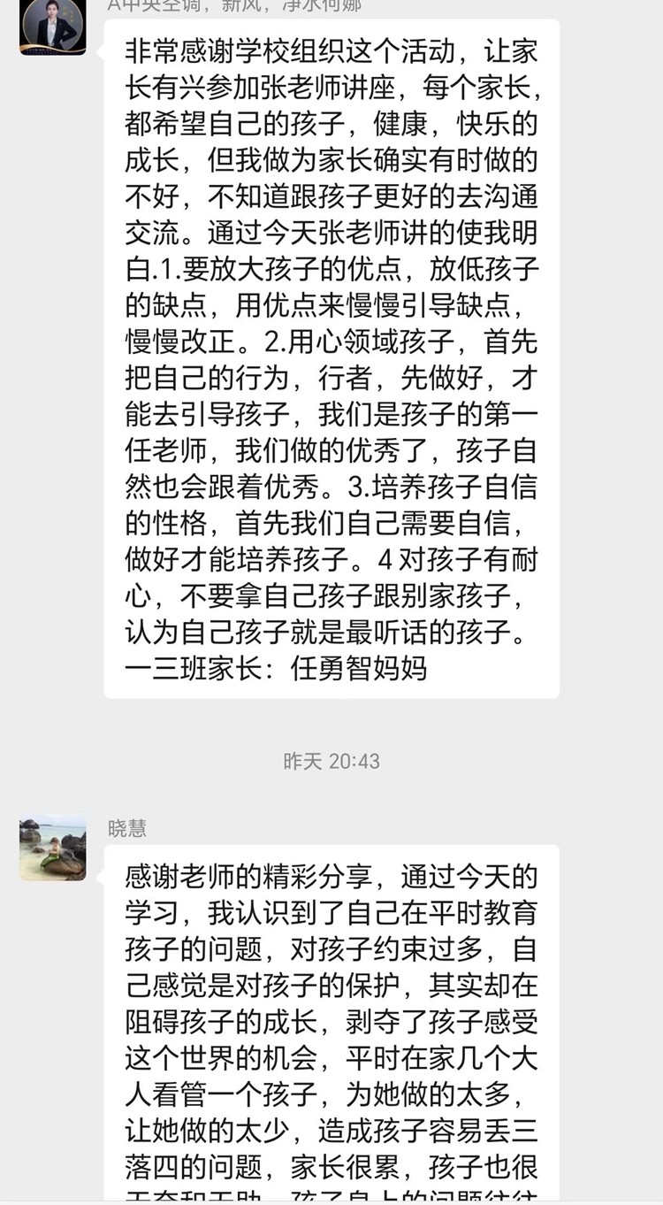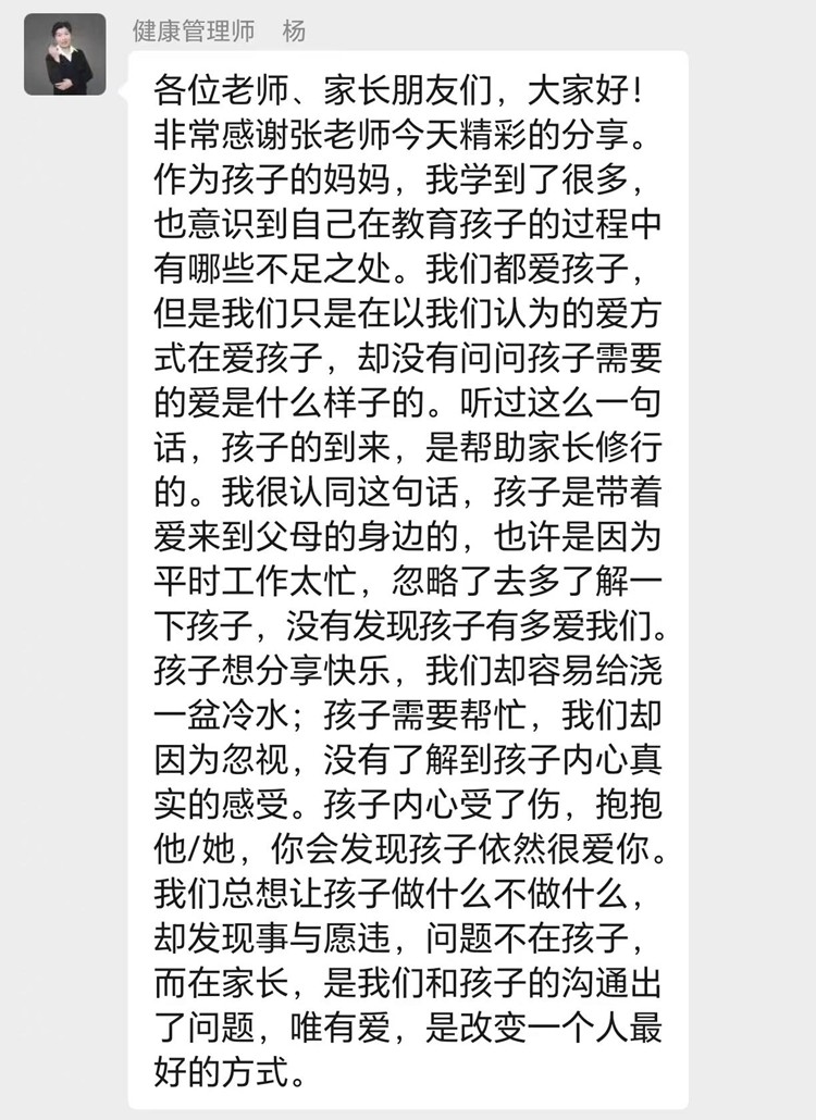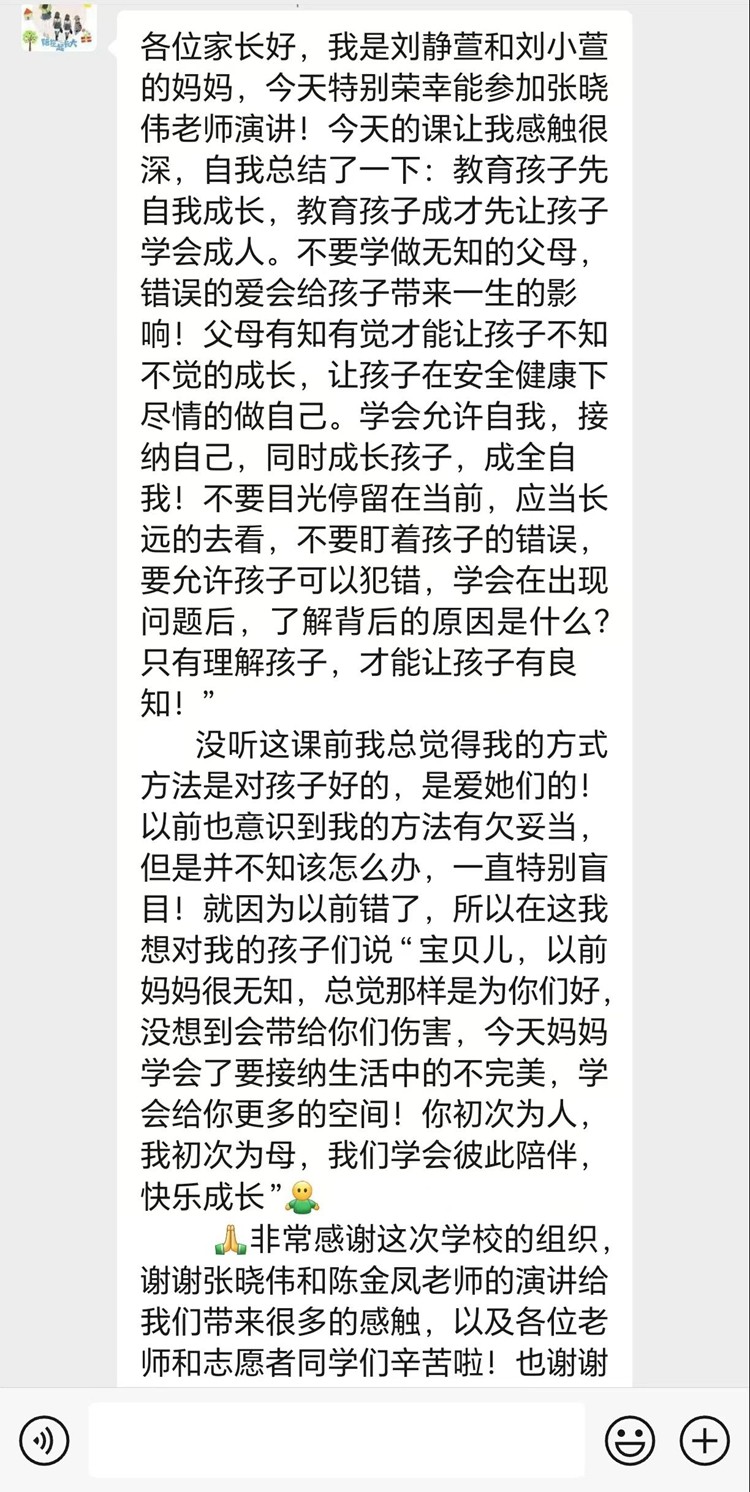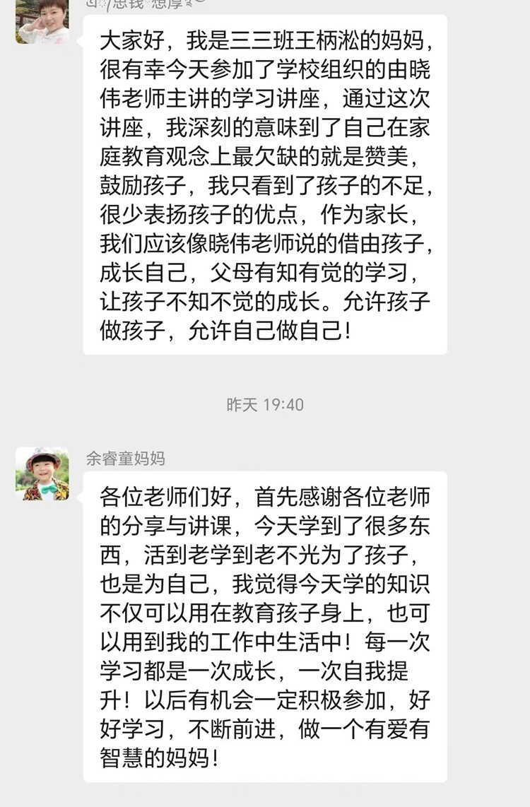 此次家長學(xué)校的開展,讓家長朋友們認識到了家庭教育的重要性,更新了家長的育兒理念,拉近了學(xué)校和家長之間的距離,也使家長們深切感受到教育孩子應(yīng)該從習(xí)慣抓起,更體會到孩子的教育不能只靠學(xué)校,還需要在家庭中潛移默化地影響孩子。
