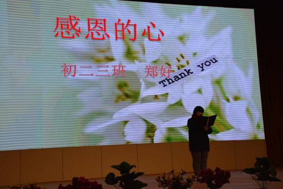 楊柯同學在演講中號召大家:“同學們,讓我們用一顆感恩的心去生活吧,去感謝那讓我們獲得溫暖的太陽;去感謝那讓我們擁有清水的河流;去感謝讓我們擁有生存空間的大地;去感謝帶我們來到人間的父母,感謝豐富我們?nèi)松啔v的老師。讓我們從現(xiàn)在做起,從點滴做起,把感恩放在心中,把謝謝放在嘴邊,把溫暖傳給他人,把快樂灑滿身邊 ,此時,你會發(fā)現(xiàn),生活多了色彩,學習添了生機,而你的成長,會如茁壯的森林,健康向上;會如春天的花朵,五彩芬芳,會如堅實的大地,燦爛輝煌?!钡玫皆趫鋈w師生的一致響應,拍手叫好。