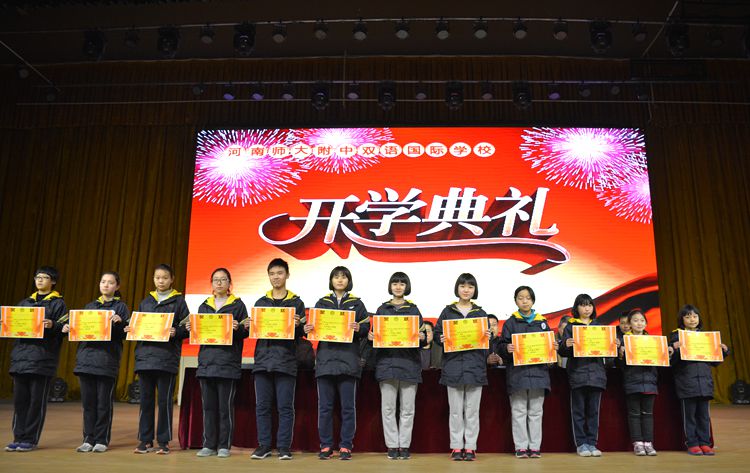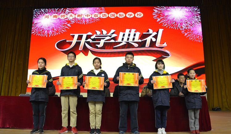 在表彰頒獎(jiǎng)環(huán)節(jié),李現(xiàn)山主任和宋玉亮主任先后宣布了《關(guān)于河南師大附中雙語國(guó)際學(xué)校學(xué)生“十星”表彰的決定》和星級(jí)學(xué)生名單、國(guó)際青少年英語大賽獲獎(jiǎng)名單,與會(huì)領(lǐng)導(dǎo)為獲獎(jiǎng)學(xué)生頒發(fā)了獎(jiǎng)狀。