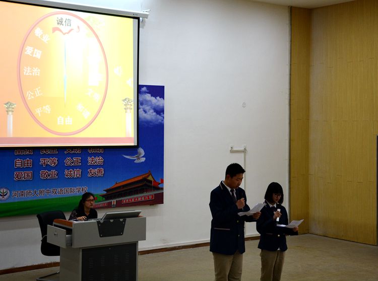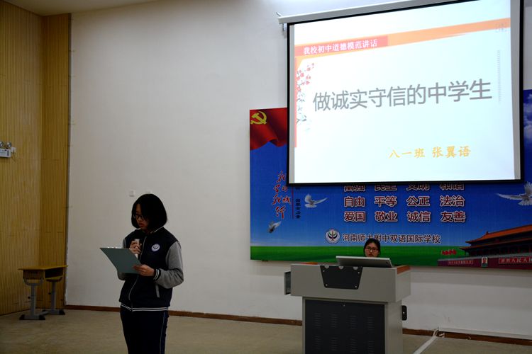為了深入開展文明城市創(chuàng)建工作,大力踐行社會主義核心價值觀,推進我校師生道德素質(zhì)和精神文明建設(shè),4月25日下午,校領(lǐng)導(dǎo)及初一、初二年級全體師生齊聚社會主義核心價值觀大講堂,參加了第二期社會主義核心價值觀之“小誠大信”主題活動。本期大講堂活動共分為五個環(huán)節(jié)進行:一講內(nèi)涵,二誦經(jīng)典,三學典型,四說踐行,五許諾言。
