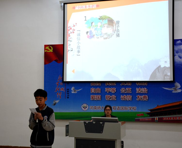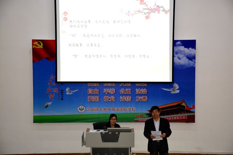 “講內(nèi)涵”環(huán)節(jié),我校黨支部書記李現(xiàn)山以激情洋溢的講話,將“誠信”的科學內(nèi)涵,巧妙地演繹為兩個生動的歷史誠信故事——“曾子殺豬”、“商鞅立木為信”,一諾千金使人格卓然于世,一諾千金使國昌盛民安泰;講話中也重視全面解析“誠信”的科學內(nèi)涵,透過慘痛的歷史教訓——“烽火戲諸侯”,讓全體師生透徹理解“誠信”是做人的根本,更是做事的底線,號召大家要在新時代堅定不移地信守承諾,誠信做人。