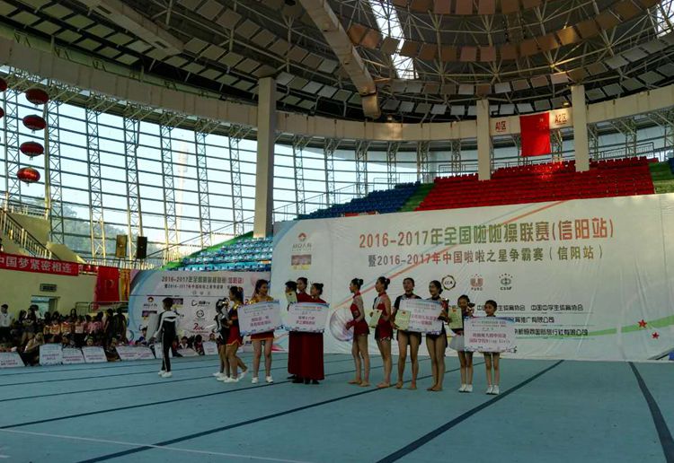 2017年5月16日至5月18日,由國(guó)家體育總局體操運(yùn)動(dòng)管理中心、中國(guó)大學(xué)生體育協(xié)會(huì)、中國(guó)中學(xué)生體育協(xié)會(huì)主辦的2016——2017年全國(guó)啦啦操聯(lián)賽(信陽(yáng)站)暨2016——2017全國(guó)啦啦操之星爭(zhēng)霸賽(信陽(yáng)賽區(qū))在信陽(yáng)師范學(xué)院綜合體育館順利舉行。國(guó)家體育總局體操運(yùn)動(dòng)管理中心領(lǐng)導(dǎo)、全國(guó)啦啦操委員會(huì)領(lǐng)導(dǎo)等出席了盛大的開幕式。