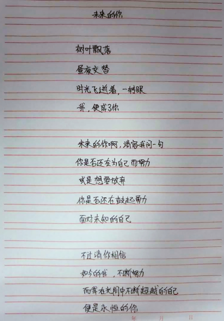 “在寢室,叫醒我們的不是哨聲而是夢想;在課堂督促我們的不是老師,而是遠(yuǎn)方?!睂懡o未來的自己一首詩,想一想未來的你會(huì)在何方懷念現(xiàn)在的自己。